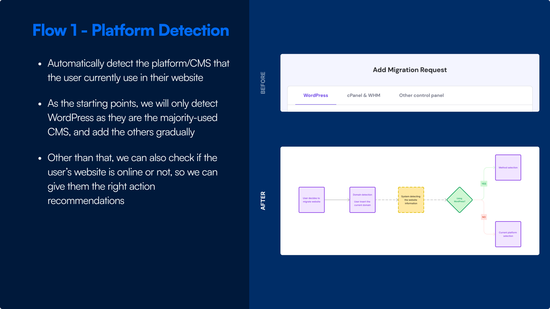 From previous main concept, we decided to break the page into several key steps: Platform Detection, Method Selection, and Destination. We also add a summary to let the user double-check and validate their website information before requesting.
