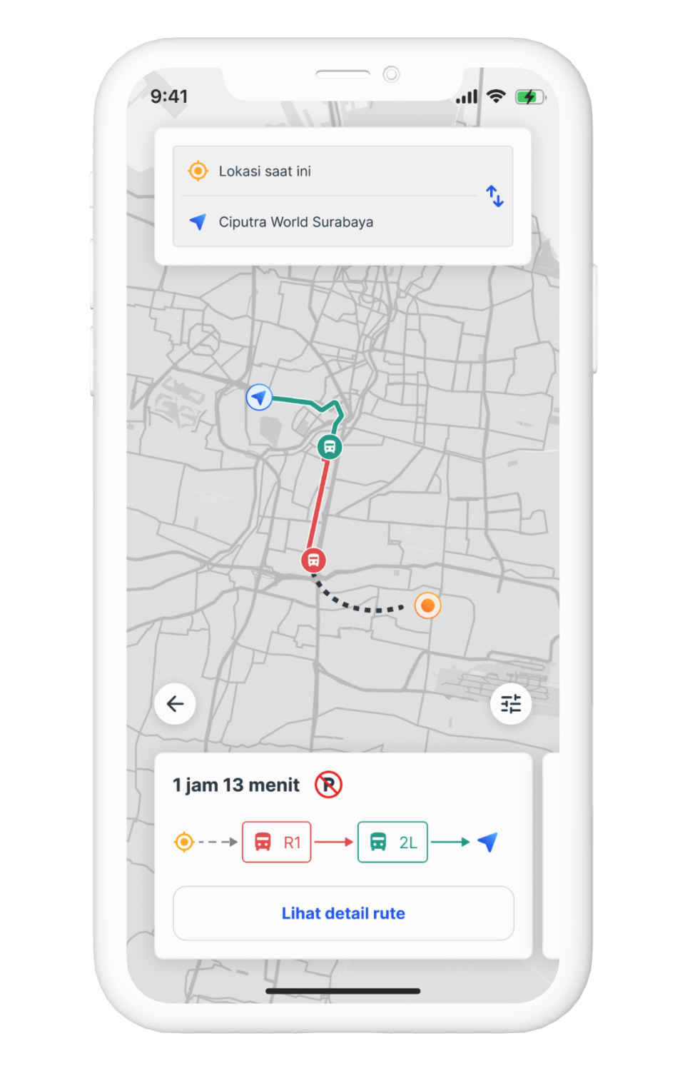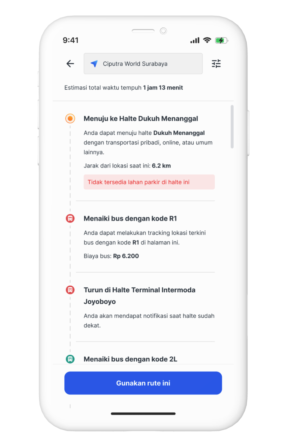 This will be the details of the route summary. Passengers will see the details like the starting bus stop including the distance from their current position, bus type that they will use including the price, where to switch the bus type if needed, and the final bus stop near the destination.