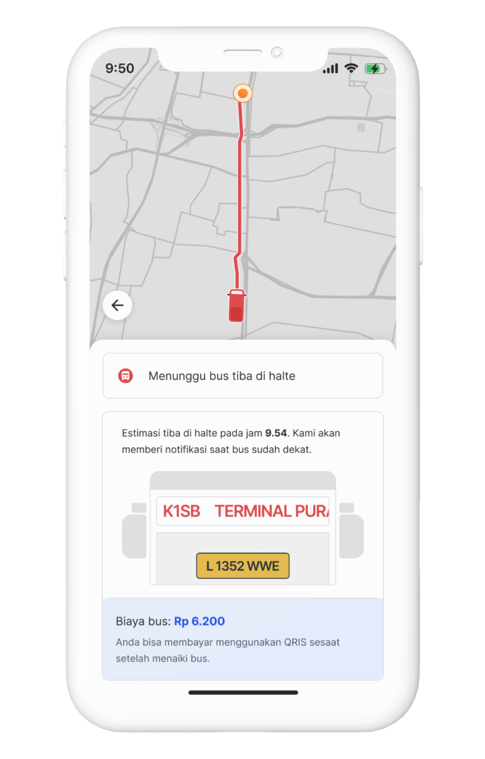 For example in this screen, is the state when the passenger is waiting in the bus stop. In this case, I show the live location of the bus (yes, the bus already have a GPS tracker), the price, vehicle license number for easier identification, and the bus code that reflect how the bus code shown in real life (most important).
